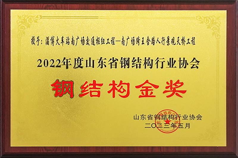 6月16—18日在環(huán)渤海地區(qū)鋼結(jié)構(gòu)行業(yè)發(fā)展峰會暨山東省鋼結(jié)構(gòu)行業(yè)協(xié)會年會上,山東經(jīng)典重工集團股份有限公司承建的淄博火車站南廣場交通樞紐工程——南廣場跨王舍路人行景觀天橋工程榮獲2022年度山東省鋼結(jié)構(gòu)協(xié)會鋼結(jié)構(gòu)金獎。